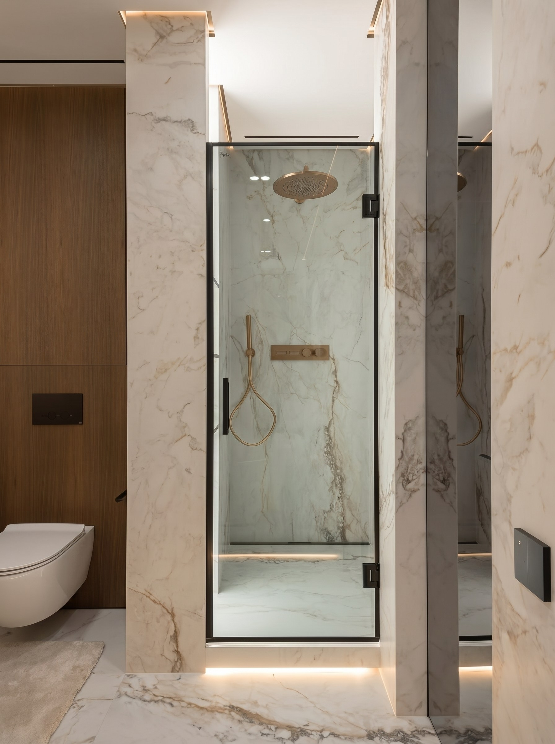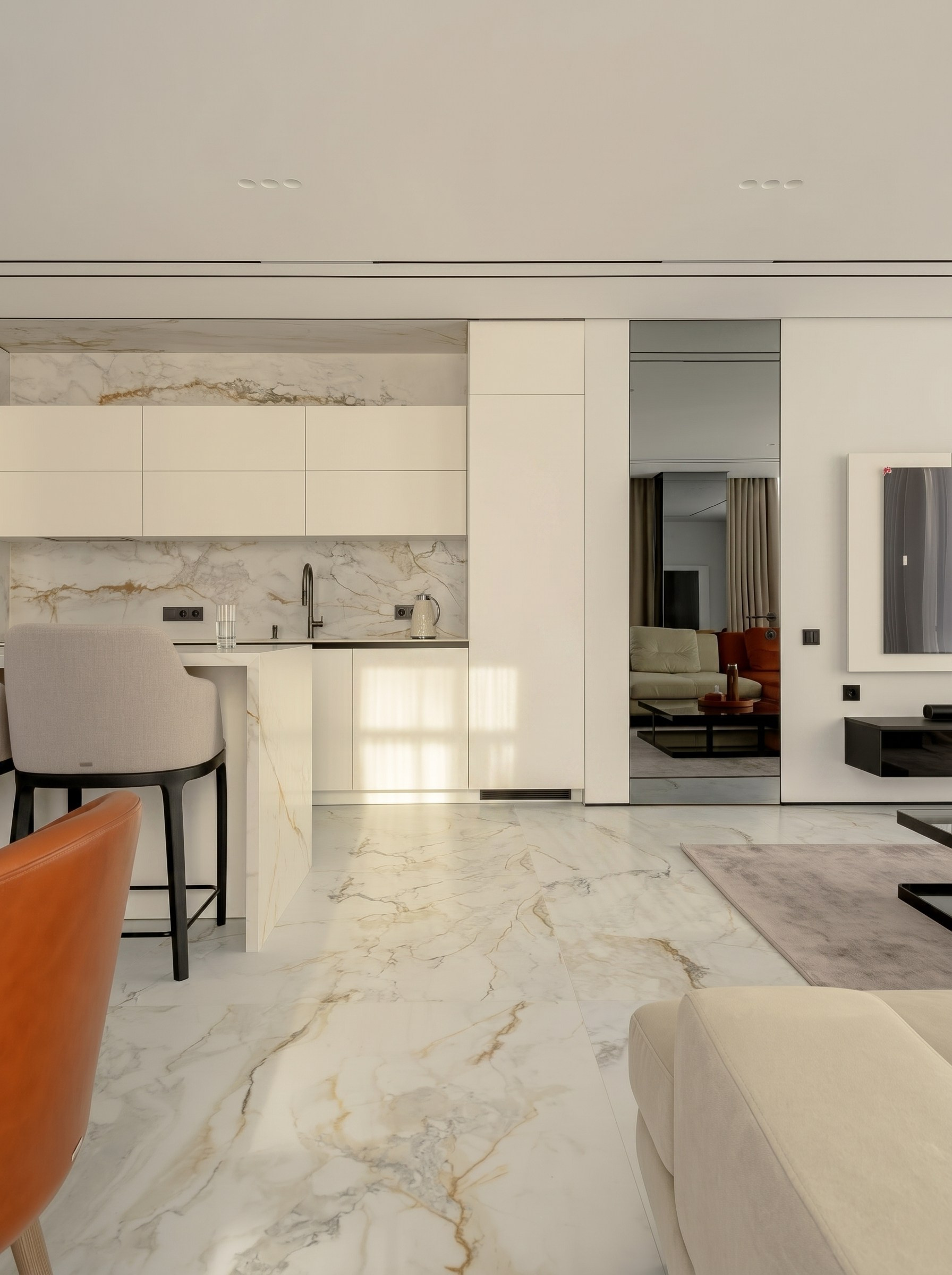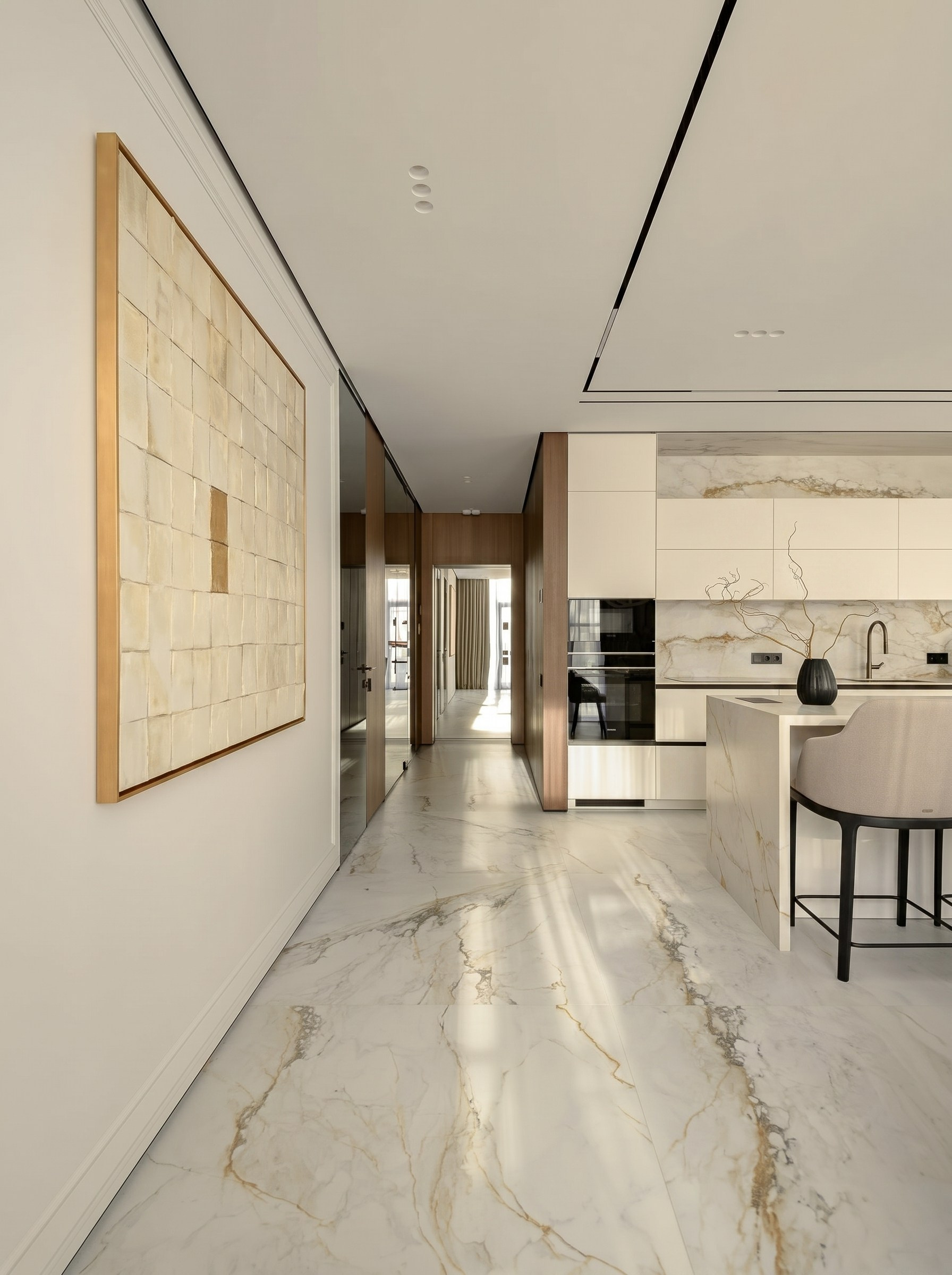Этот проект — о спокойном премиальном интерьере, в котором выразительность строится не на декоре, а на качестве пространства. Светлый камень, тёплый ореховый шпон, зеркальные поверхности, латунные акценты и мягкий свет складываются в цельную среду без визуального шума.