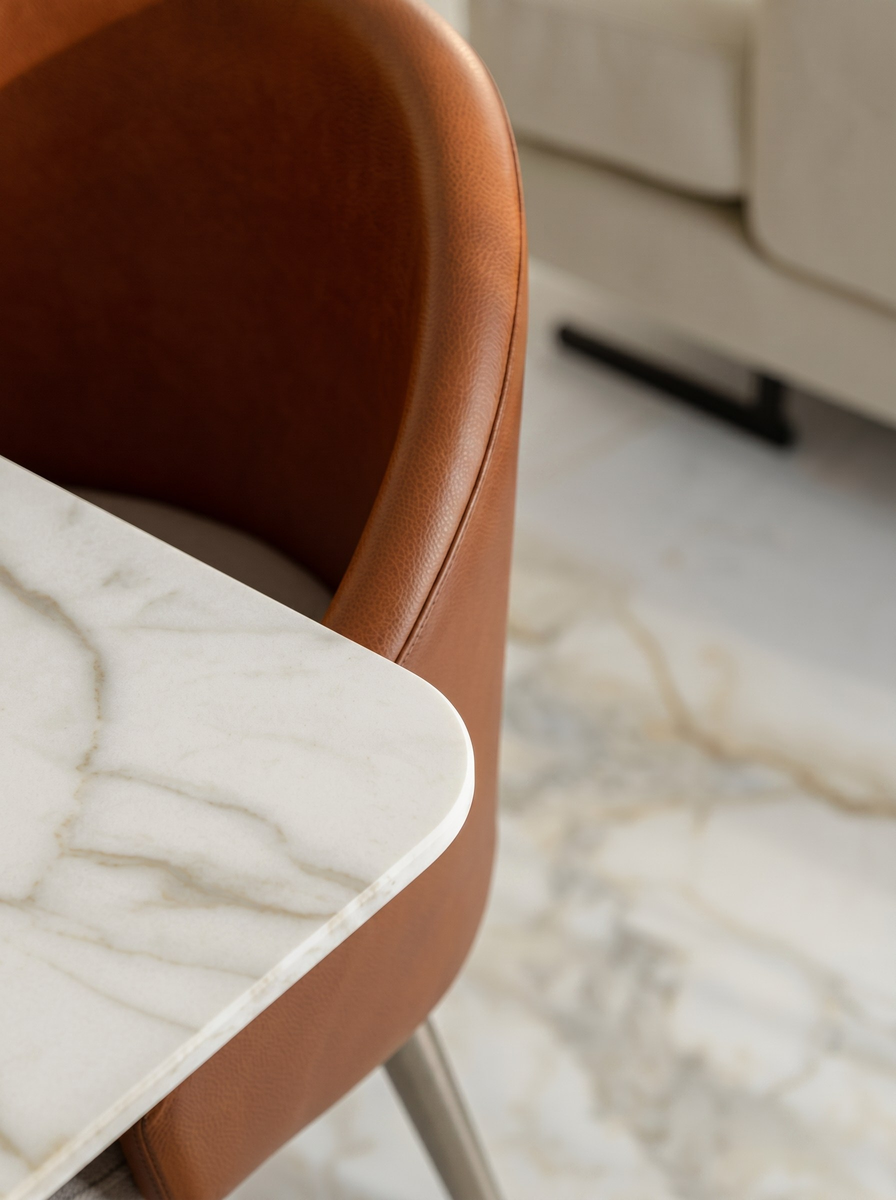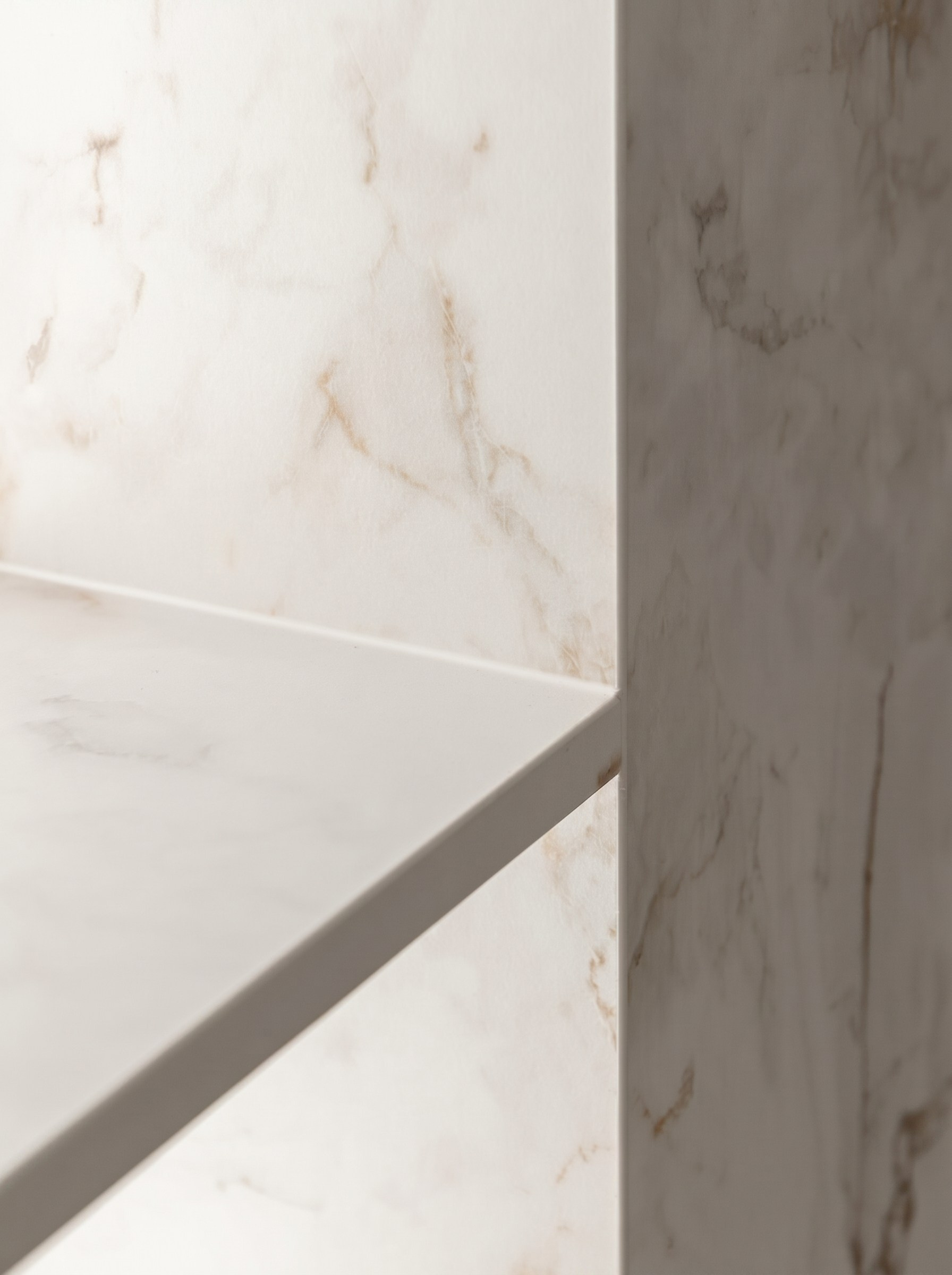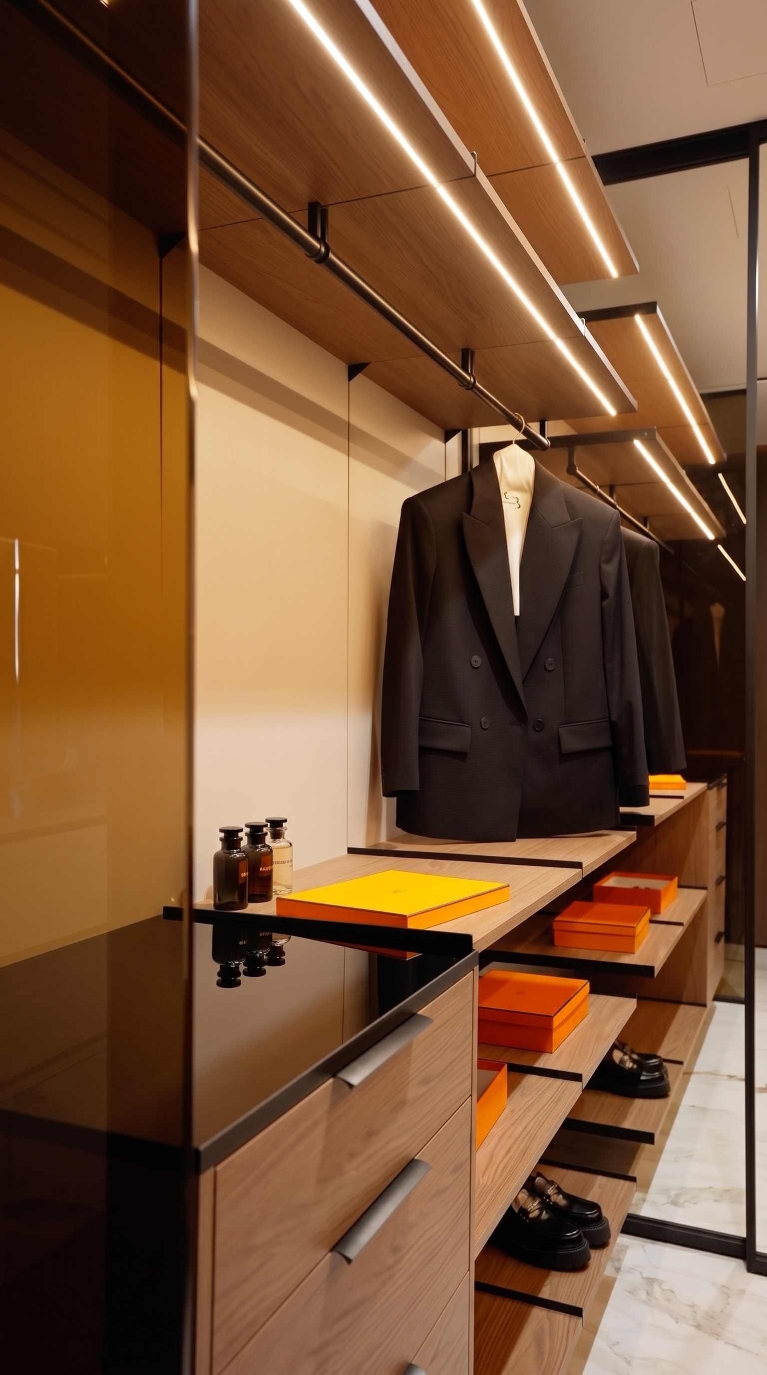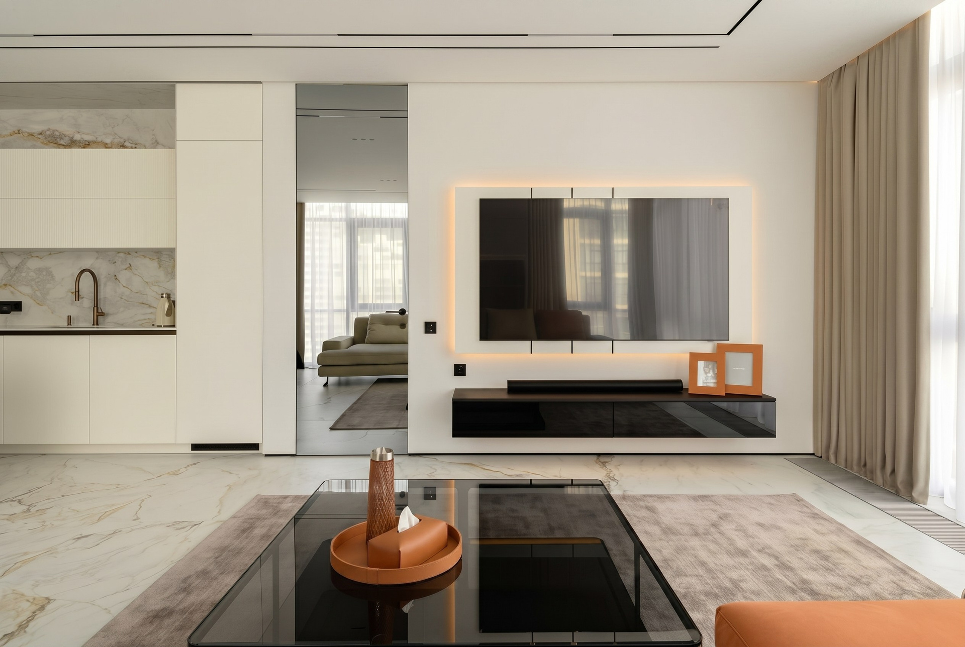 Этот проект — о спокойном премиальном интерьере, в котором выразительность строится не на декоре, а на качестве пространства. Светлый камень, тёплый ореховый шпон, зеркальные поверхности, латунные акценты и мягкий свет складываются в цельную среду без визуального шума.