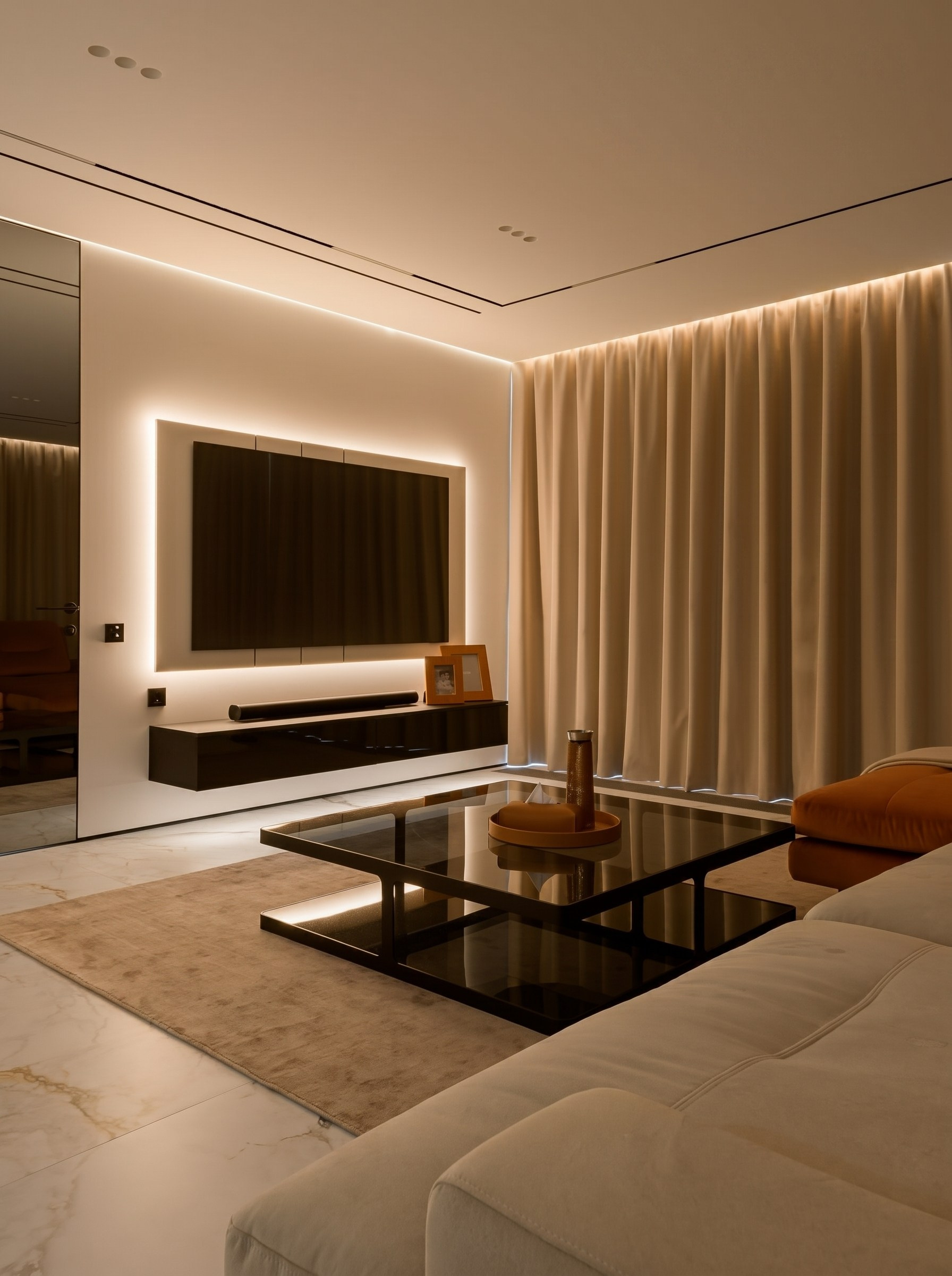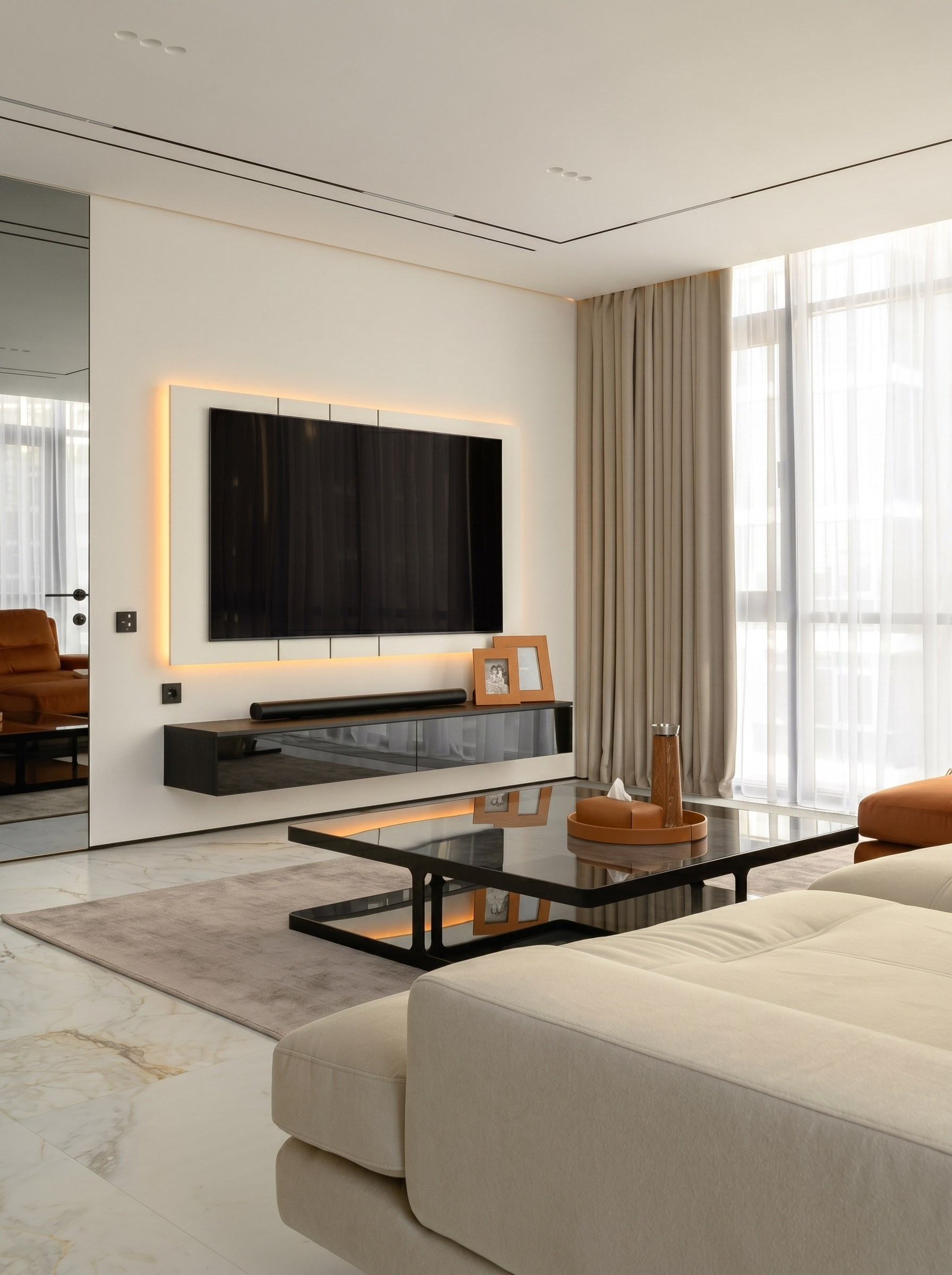 Подвесная консоль и подсветка делают композицию легче, а отсутствие случайного декора позволяет интерьеру дольше сохранять актуальность. Это пространство, в котором комфорт ощущается сразу — без перегруза и без лишней визуальной суеты.