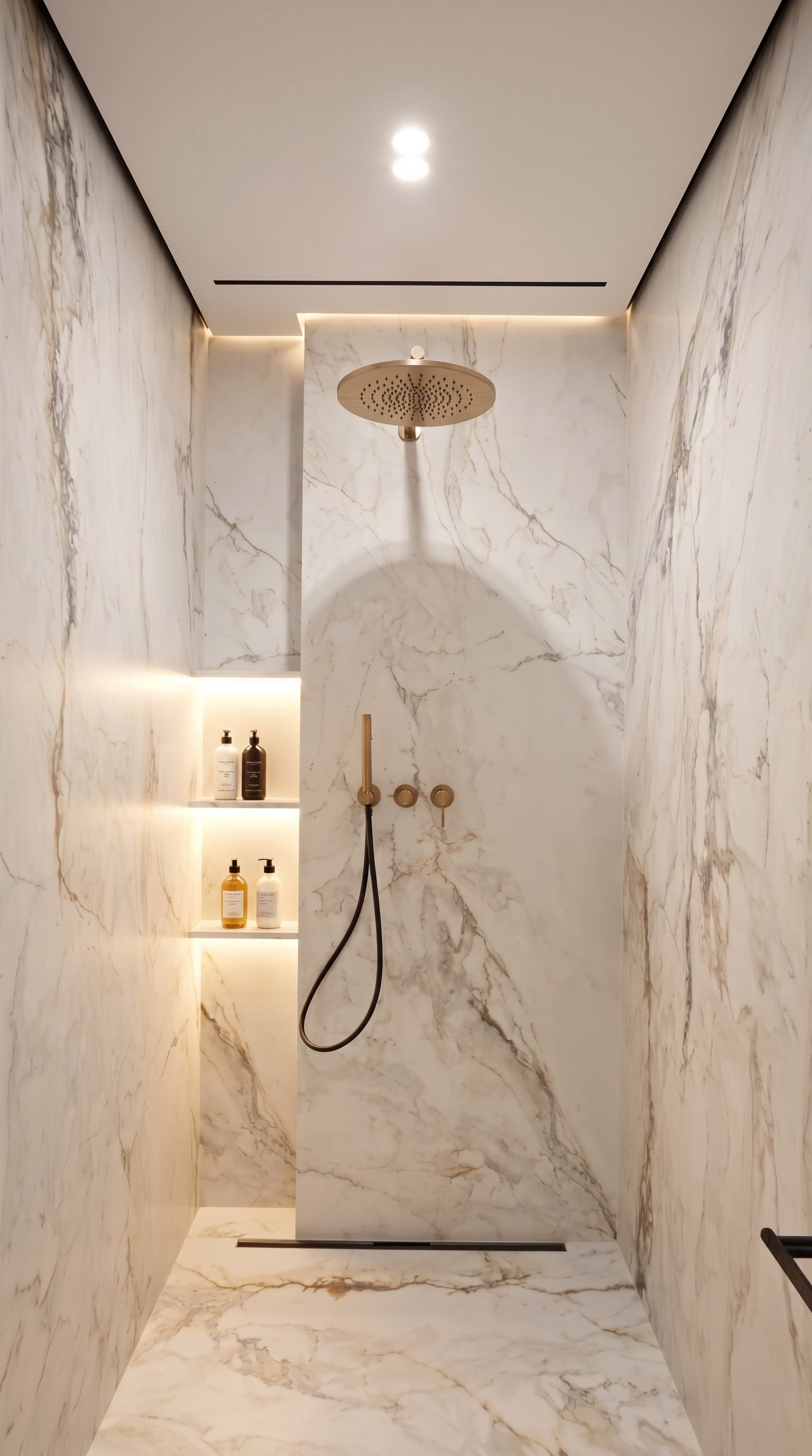 Душевая выполнена лаконично и чисто: стеклянное ограждение, встроенные ниши, линейный трап и отсутствие лишних деталей сохраняют цельность пространства и упрощают ежедневное использование.