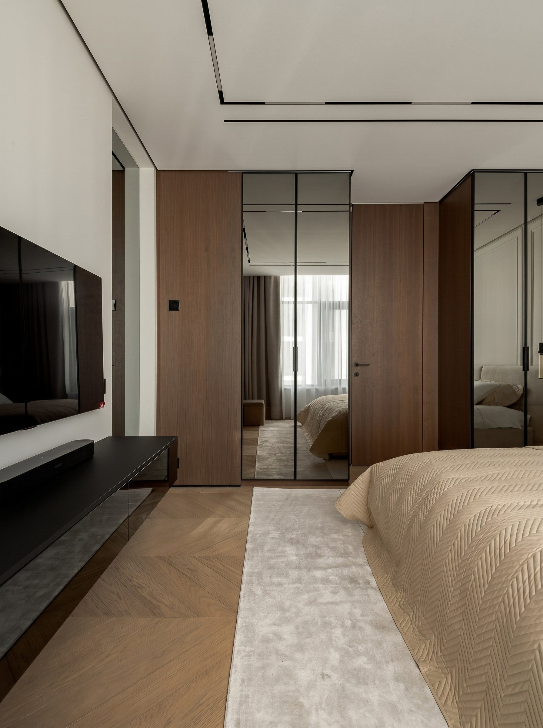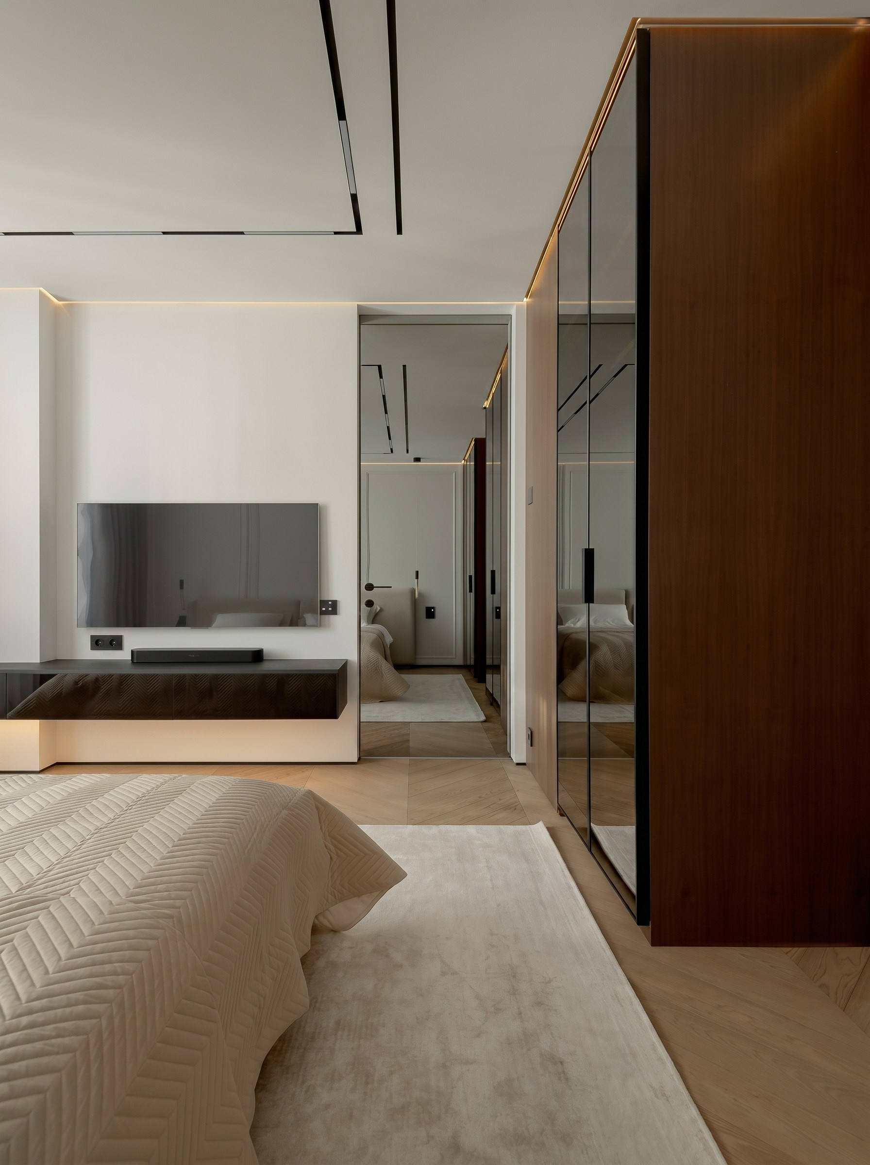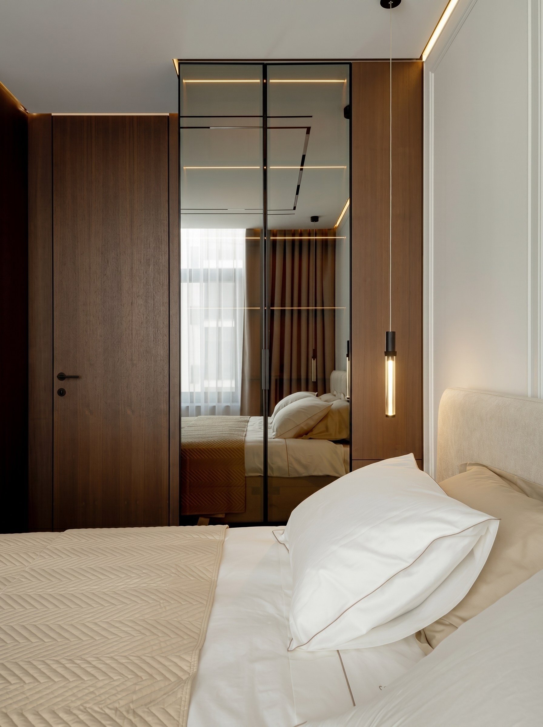 Системы хранения в спальне интегрированы так, чтобы крупные объёмы не утяжеляли интерьер. Зеркальные фасады, тонкий профиль и встроенность позволяют сохранить визуальную свободу комнаты, отражают свет и усиливают ощущение порядка.