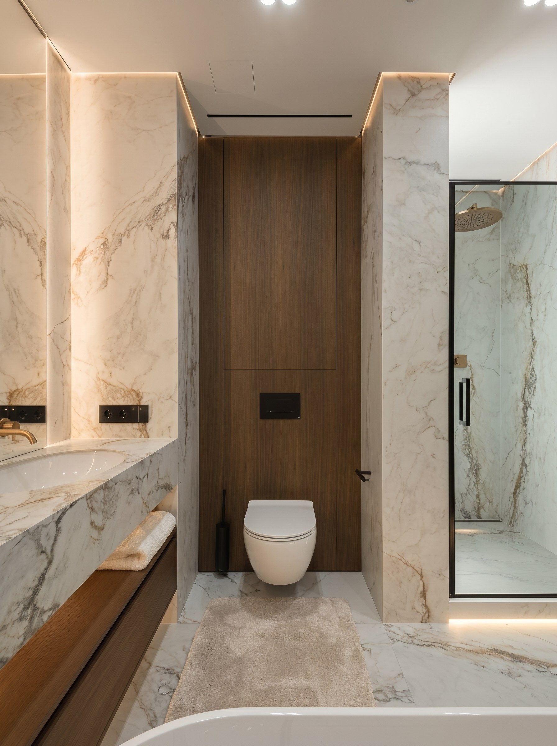 Мастер-санузел решён как цельное приватное пространство с атмосферой домашнего спа. Крупноформатный камень под мрамор формирует единую оболочку и связывает все основные зоны: ванну, душевую, блок раковины и инсталляцию.
