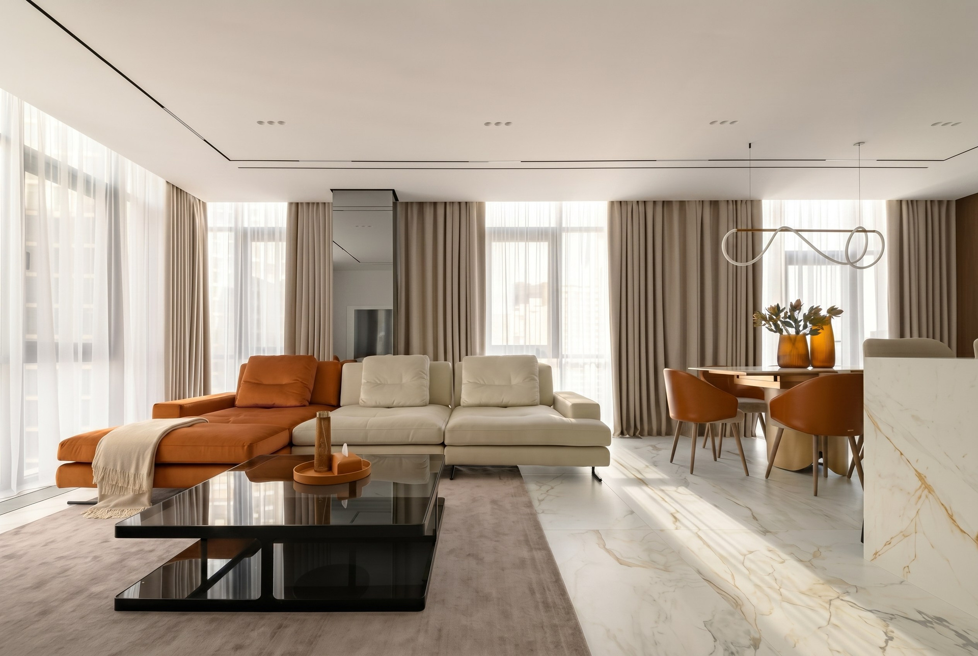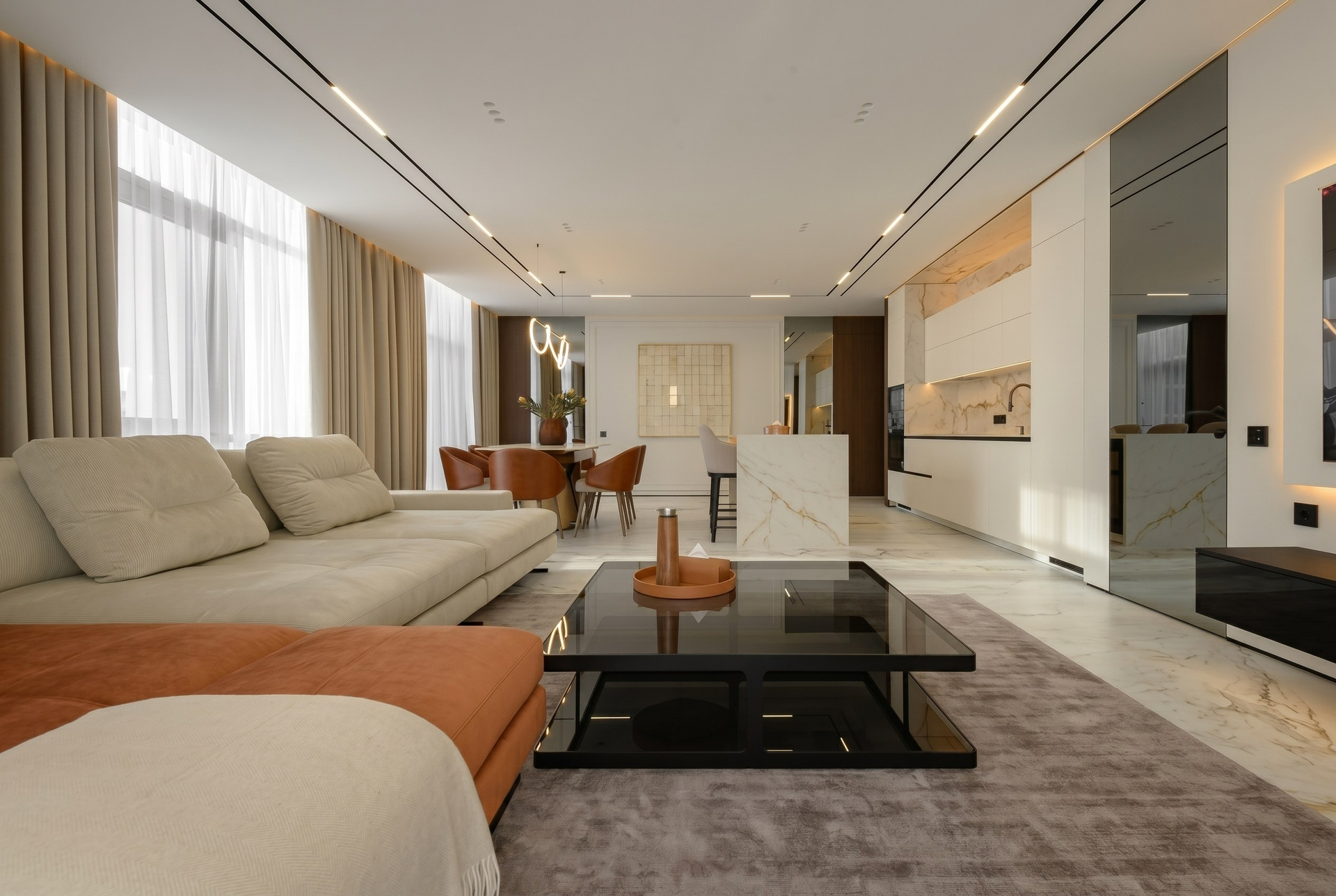 За счёт этого интерьер одинаково хорошо работает и для повседневной жизни, и для приёма гостей, сохраняя общую сдержанность и премиальный характер.