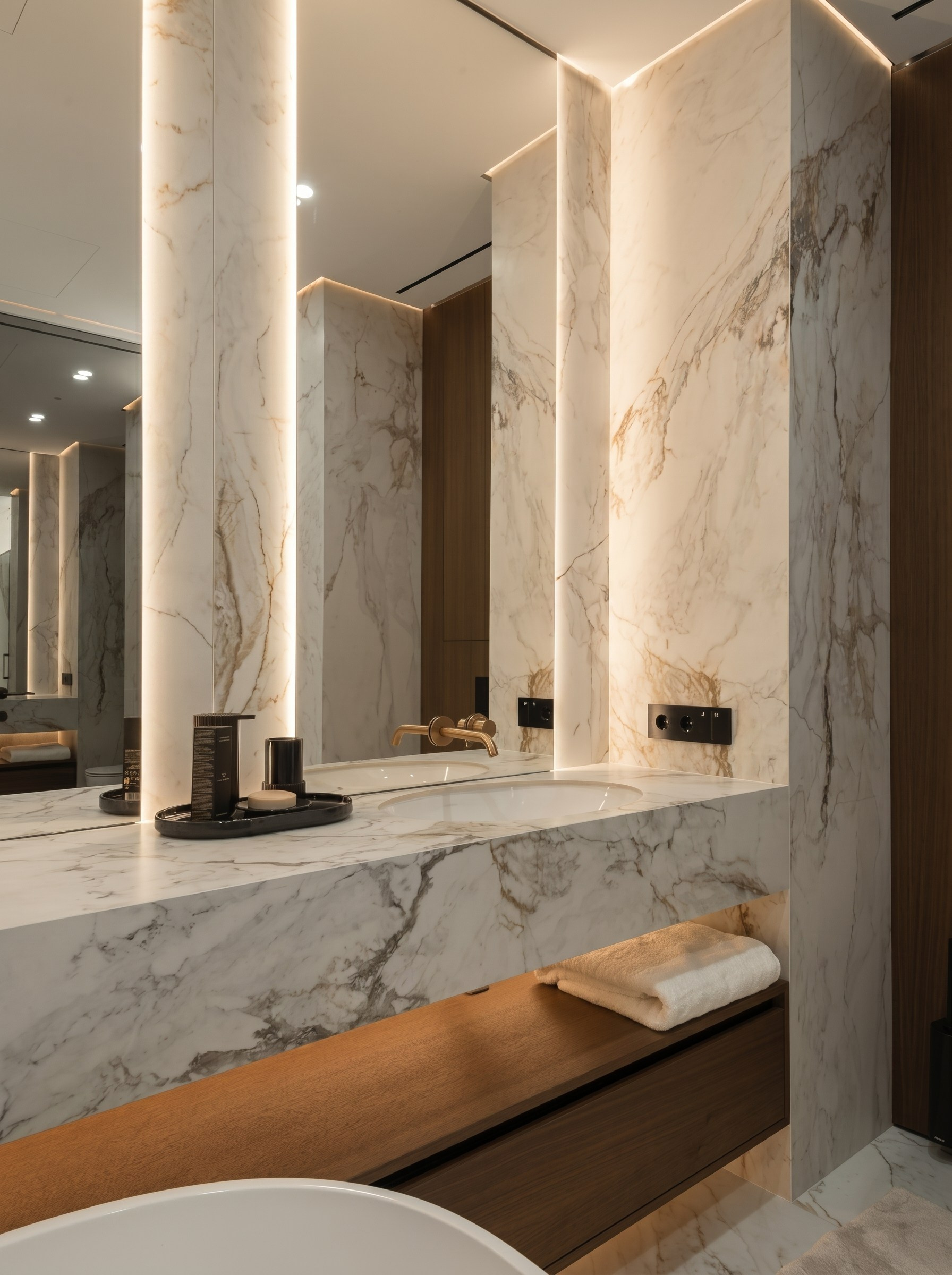 Зона раковины решена как чистый монолитный объём с интегрированной столешницей и подвесной тумбой в тёплой древесной отделке. Дерево смягчает камень, а вертикальная подсветка и зеркальные поверхности усиливают глубину и подчёркивают геометрию пространства.
