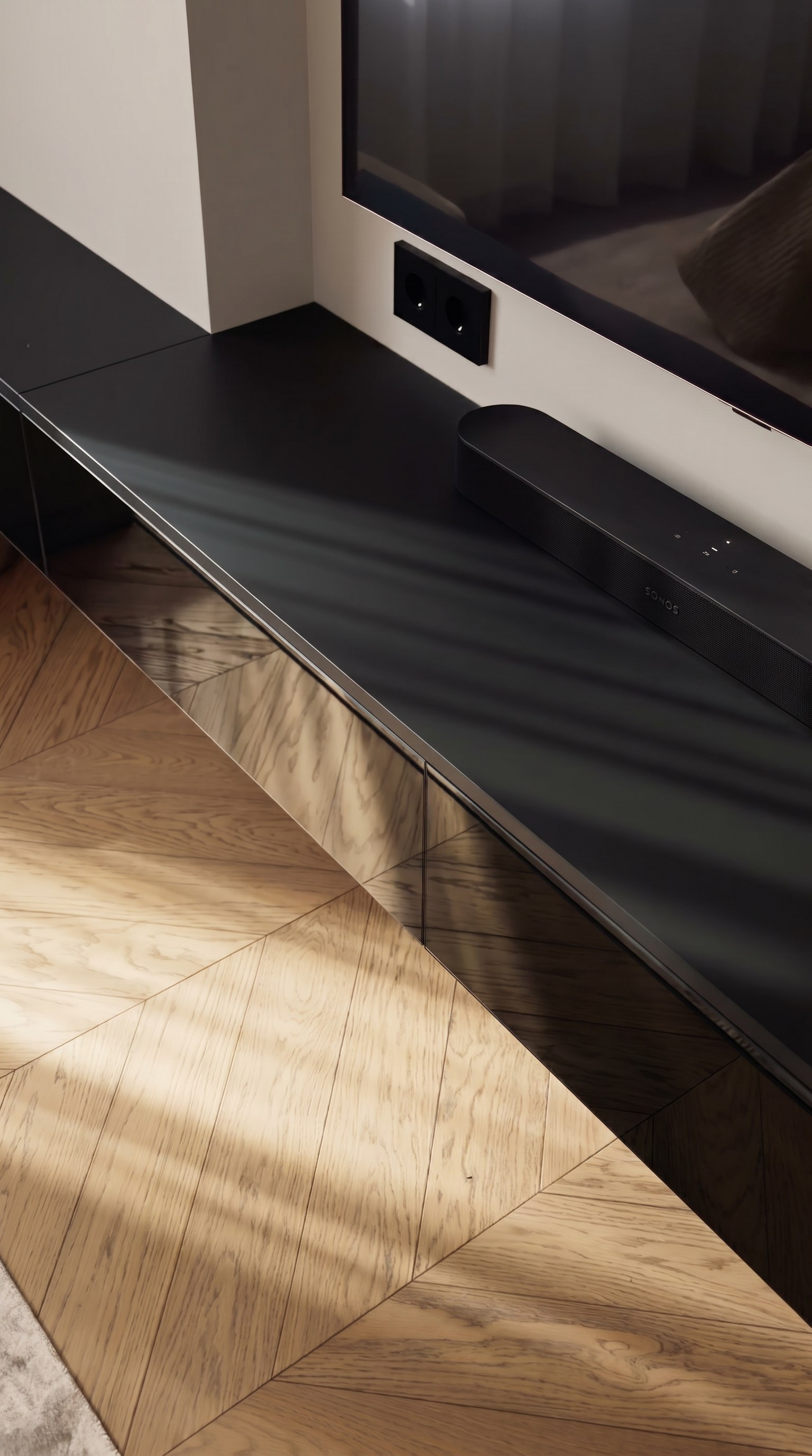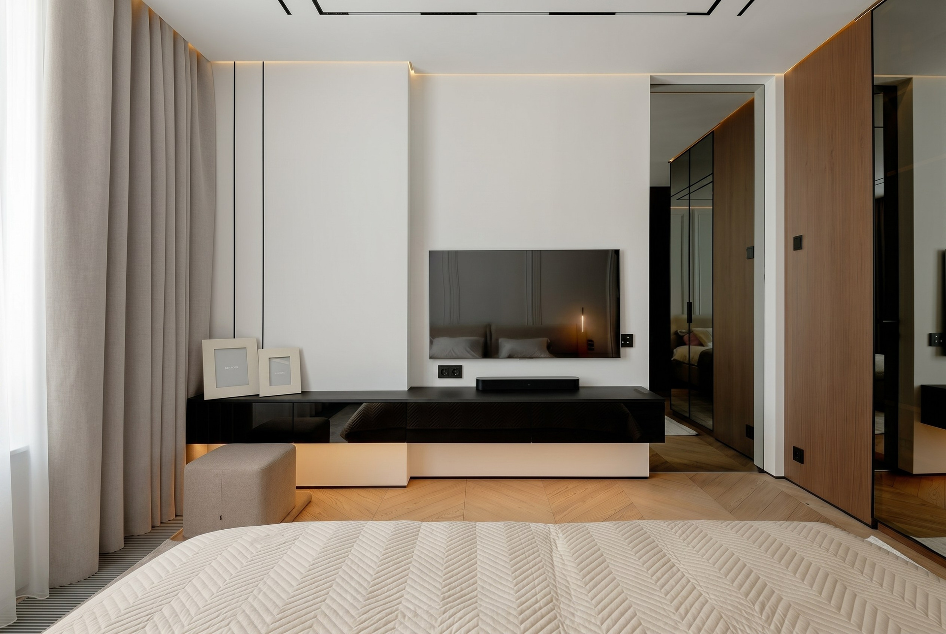 ТВ-зона решена предельно лаконично: подвесная консоль, чистая горизонталь и мягкая нижняя подсветка поддерживают общий ритм спальни и не перегружают пространство.
