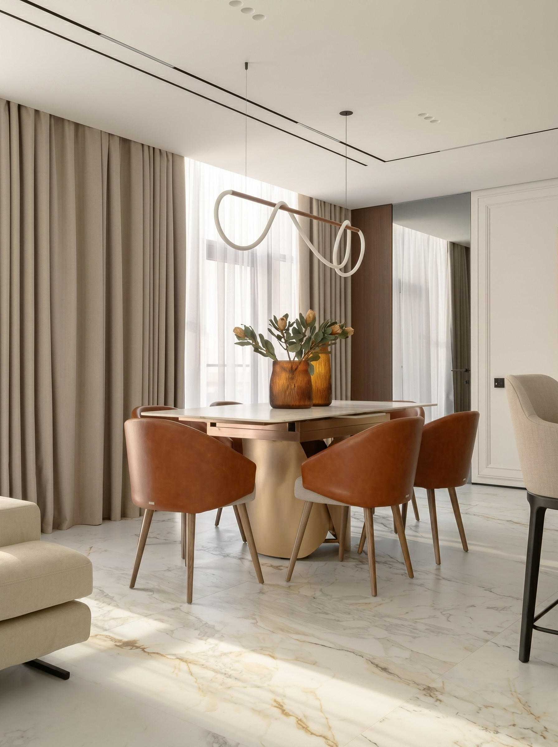 Обеденная группа смягчает общую геометрию пространства и добавляет интерьеру более тёплый, камерный сценарий. Светлая столешница, карамельные стулья и выразительный подвесной светильник делают зону живой и уютной.