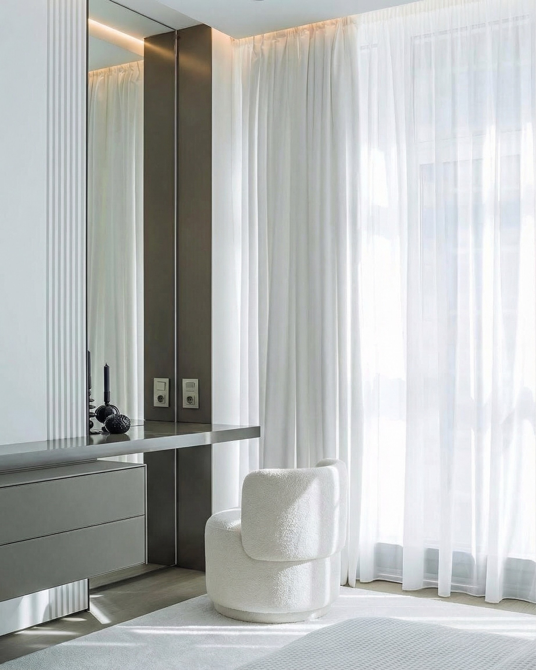 - Сценарии приватности: Продуманное зонирование позволило выделить лаунж-уголок у окна с туалетным столиком. Это место для утренних ритуалов и вечернего отдыха, залитое мягким естественным светом.