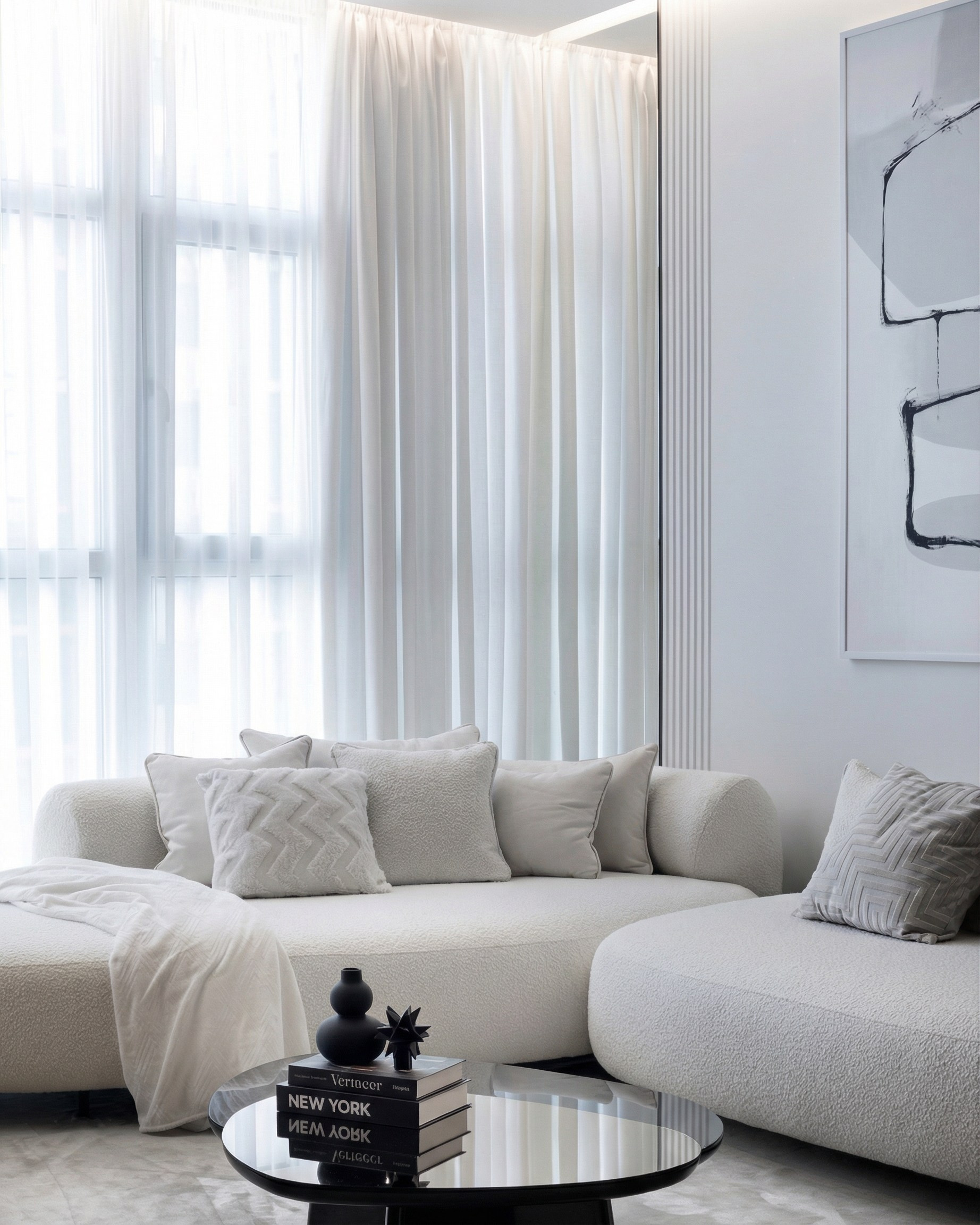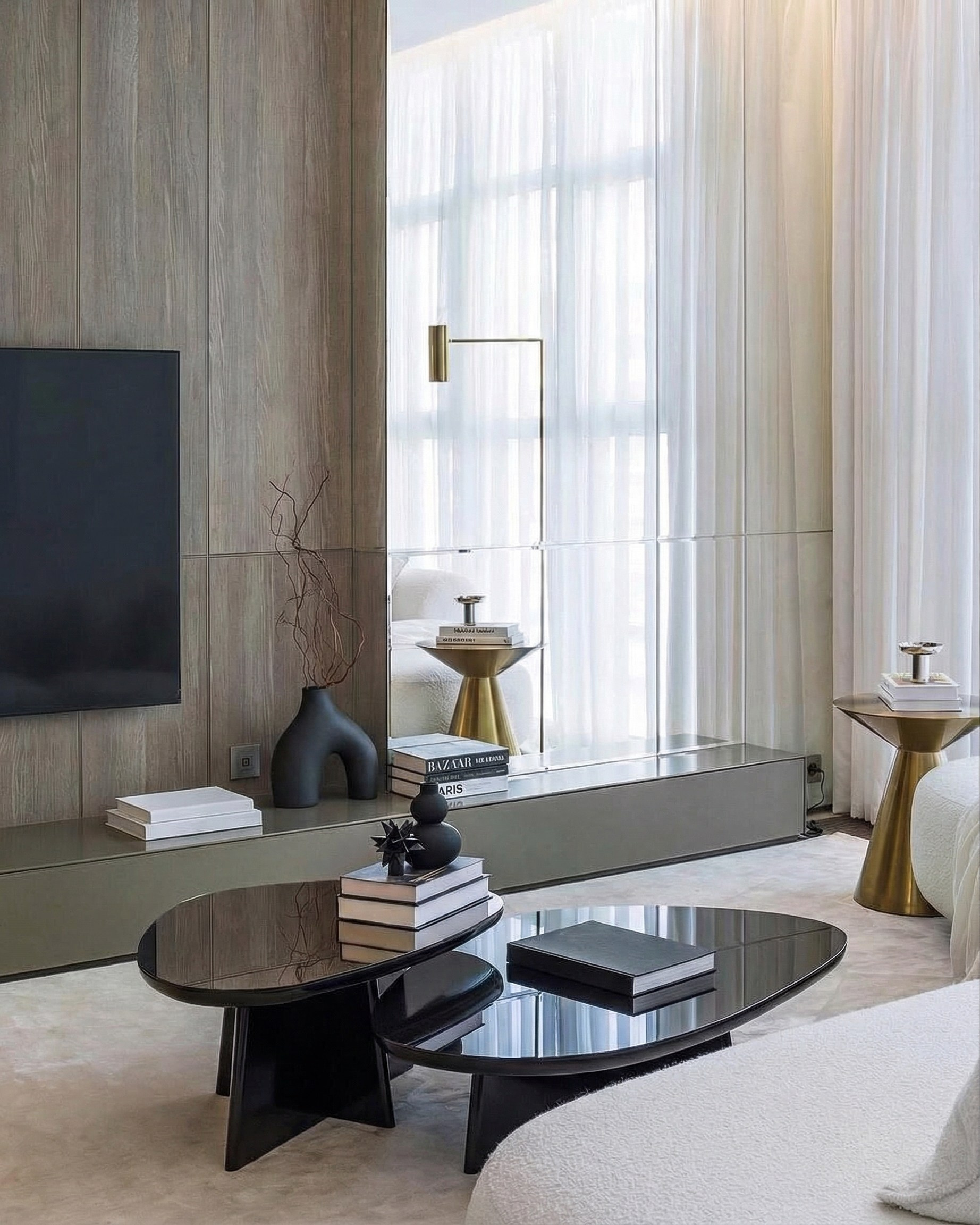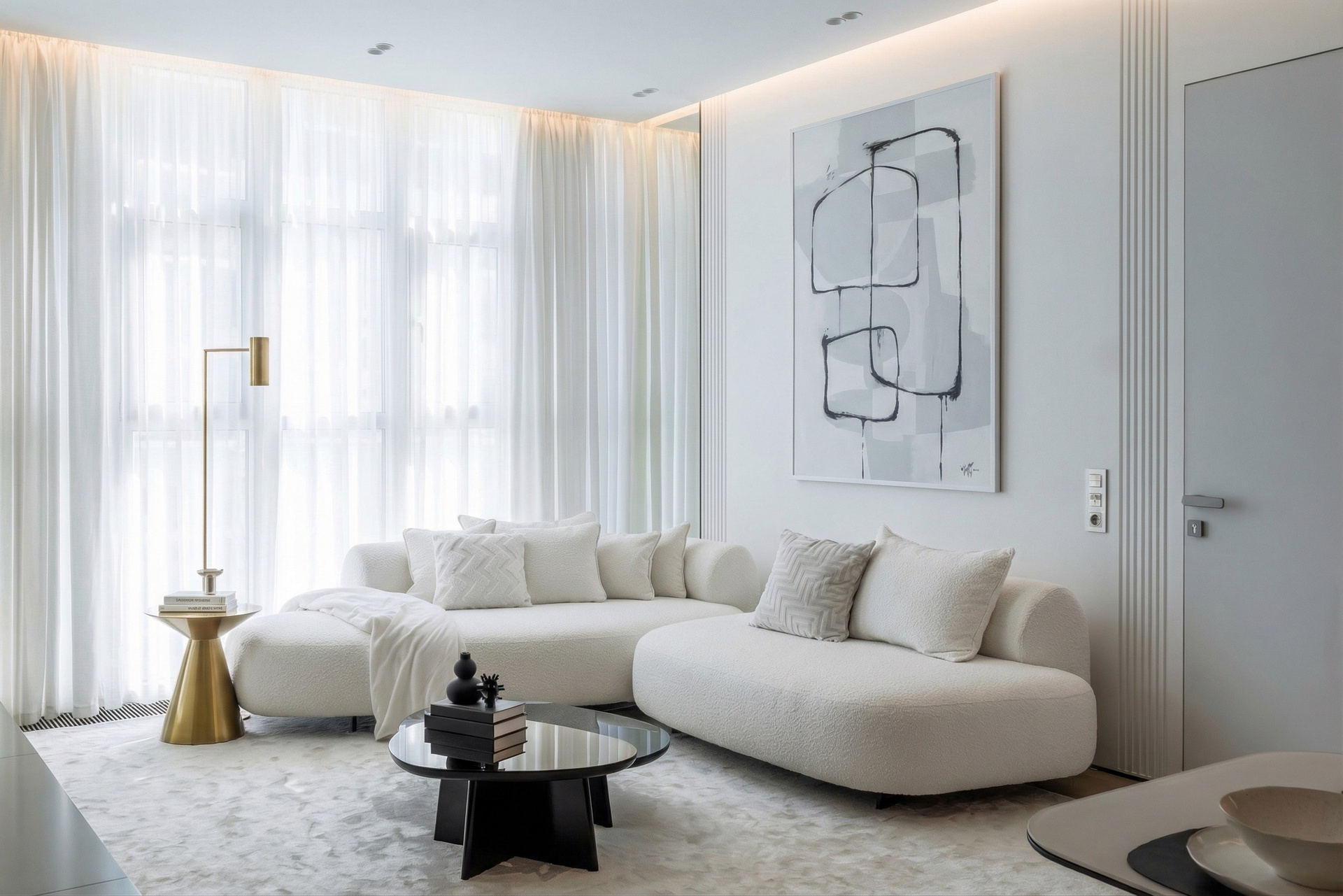 Результат — гостиная, где каждый элемент работает на ощущение визуального покоя и безупречного вкуса.