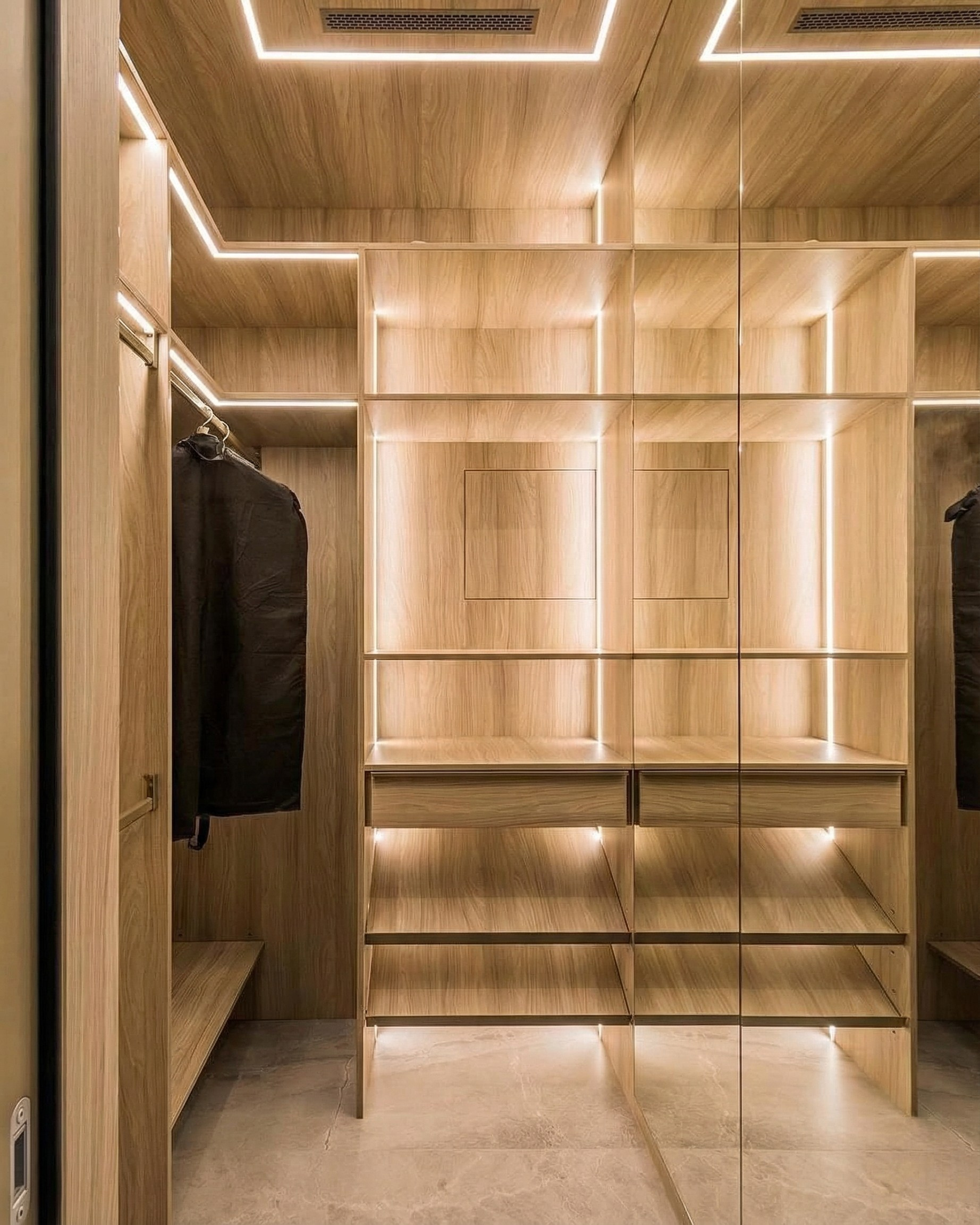 - Световой сценарий: Интегрированная вертикальная подсветка полок не только упрощает поиск, но и превращает хранение в эффектную интерьерную витрину.
