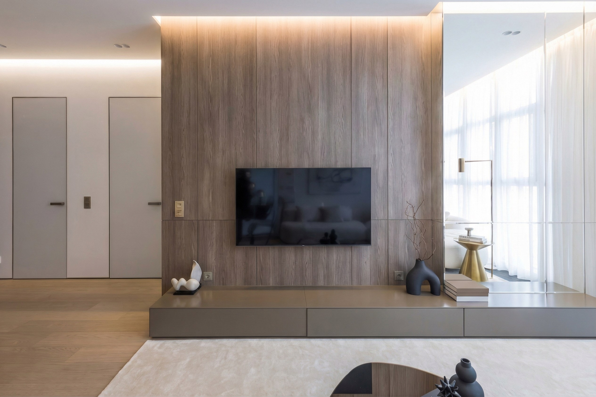 - Визуальный объем: Зеркальные панно, двери скрытого монтажа и парящие мебельные конструкции стирают границы между зонами.