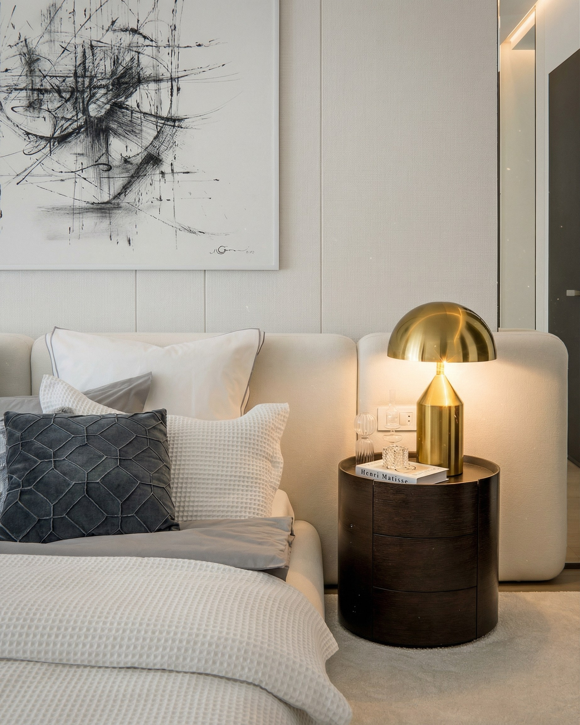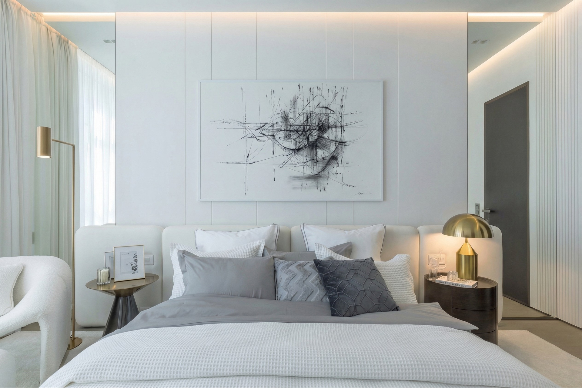 - Эстетические акценты: Графичное панно над кроватью и латунный блеск дизайнерских ламп добавляют интерьеру характер, превращая спальню в элегантный номер пятизвездочного отеля.