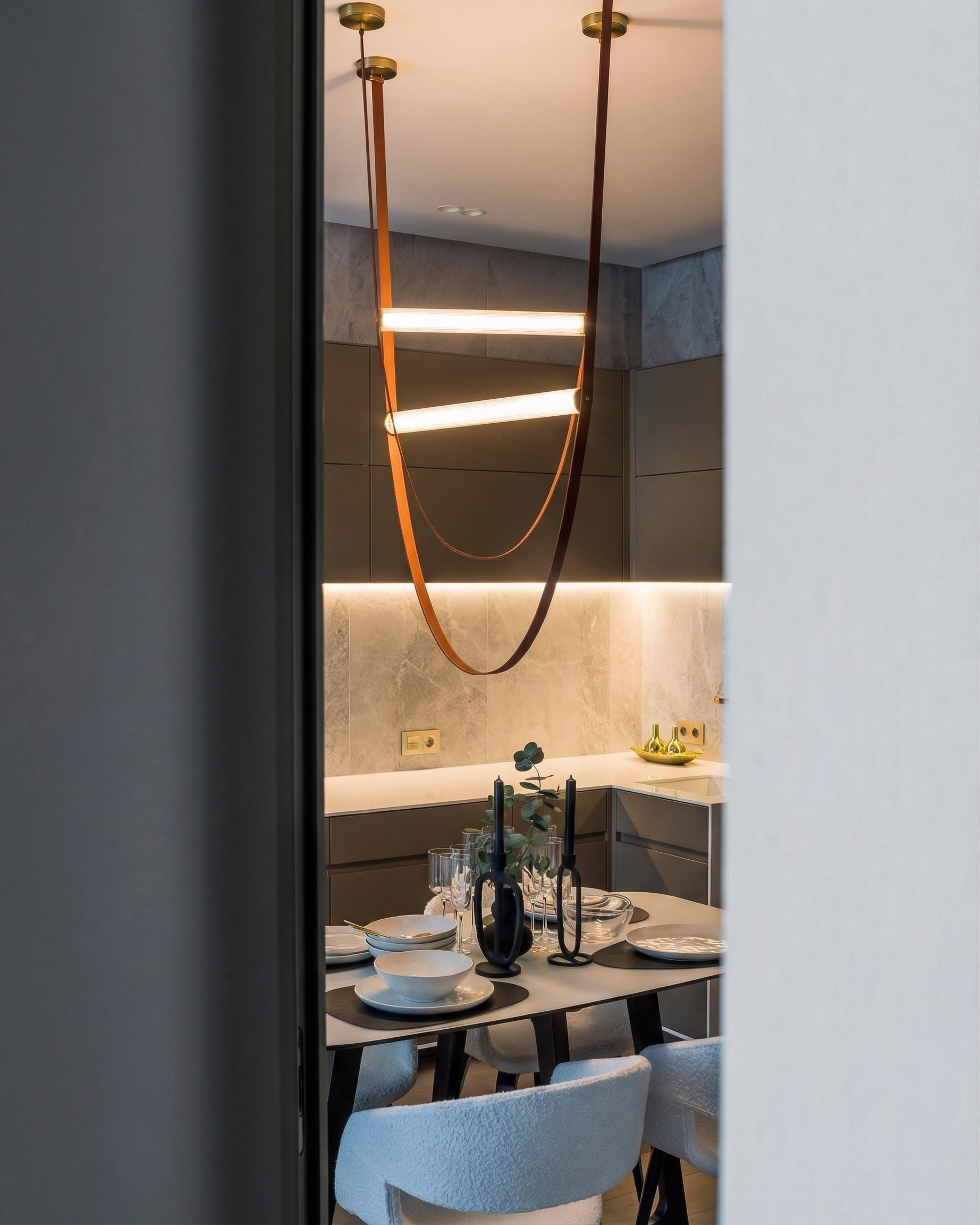 - Столовая группа как акцент: Обеденная зона с культовым светильником на кожаных ремнях становится смысловым центром. Это место для неспешных завтраков и статусных ужинов, объединяющее весь интерьер в завершенную композицию.
