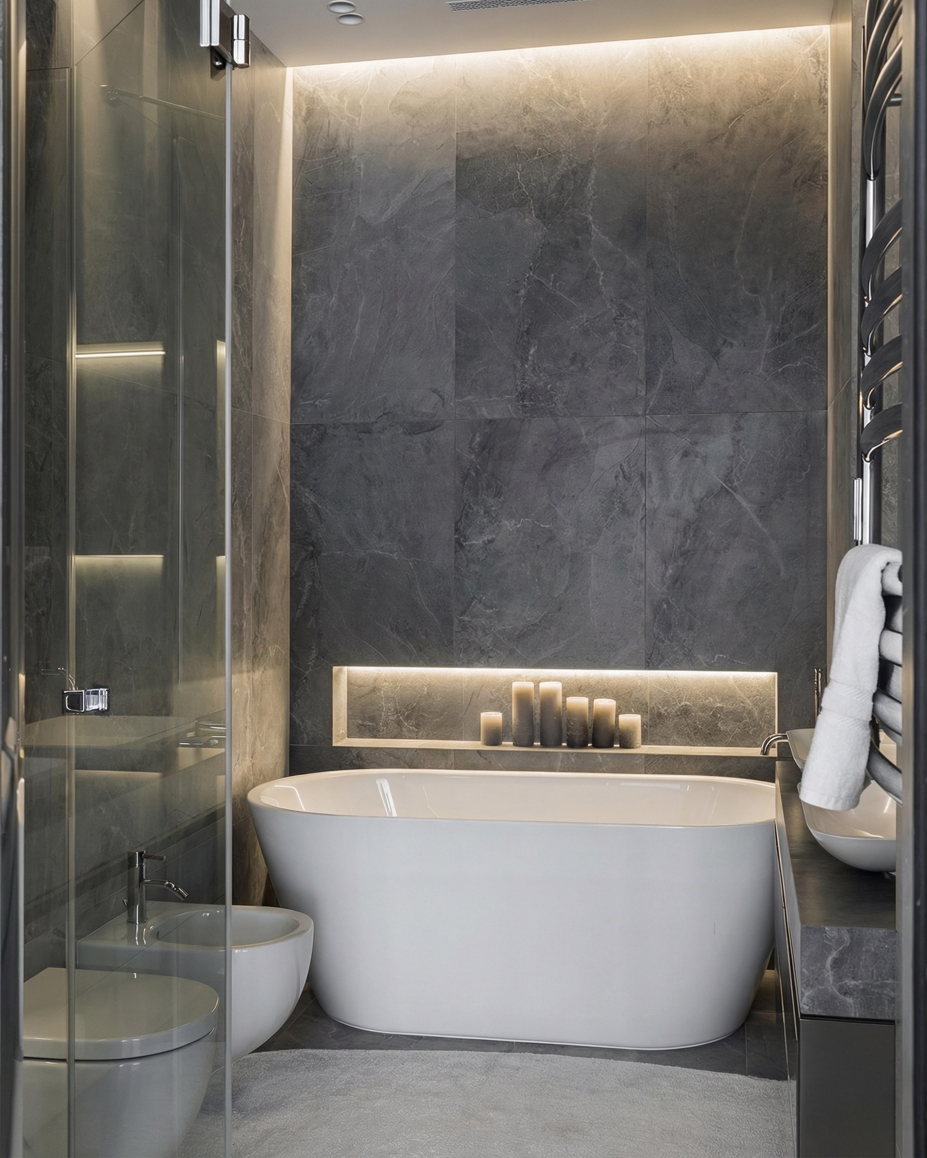 - Скульптурный минимализм: Отдельностоящая ванна на фоне широкоформатного керамогранита под натуральный камень превращает утилитарную зону в арт-объект.
