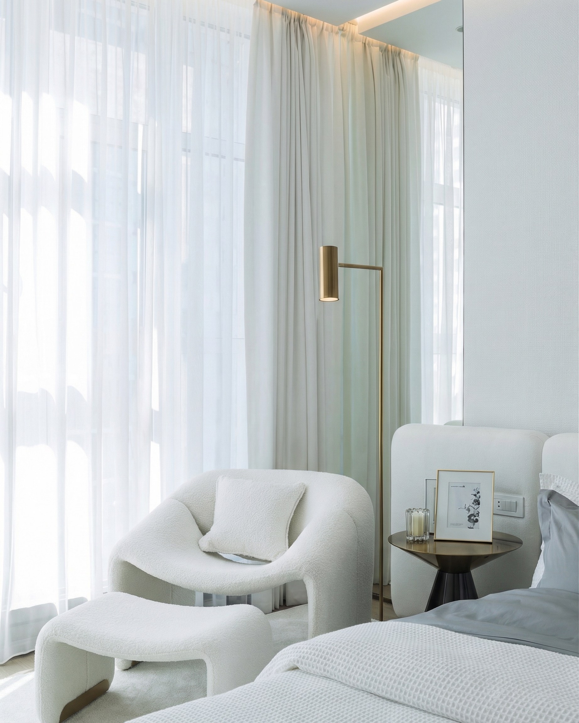 - Сенсорный дизайн: Мы сделали ставку на тактильность. Сочетание мягкого изголовья во всю стену, нежного букле в обивке кресла и плотного премиального текстиля создает ощущение защищенности и уюта.
